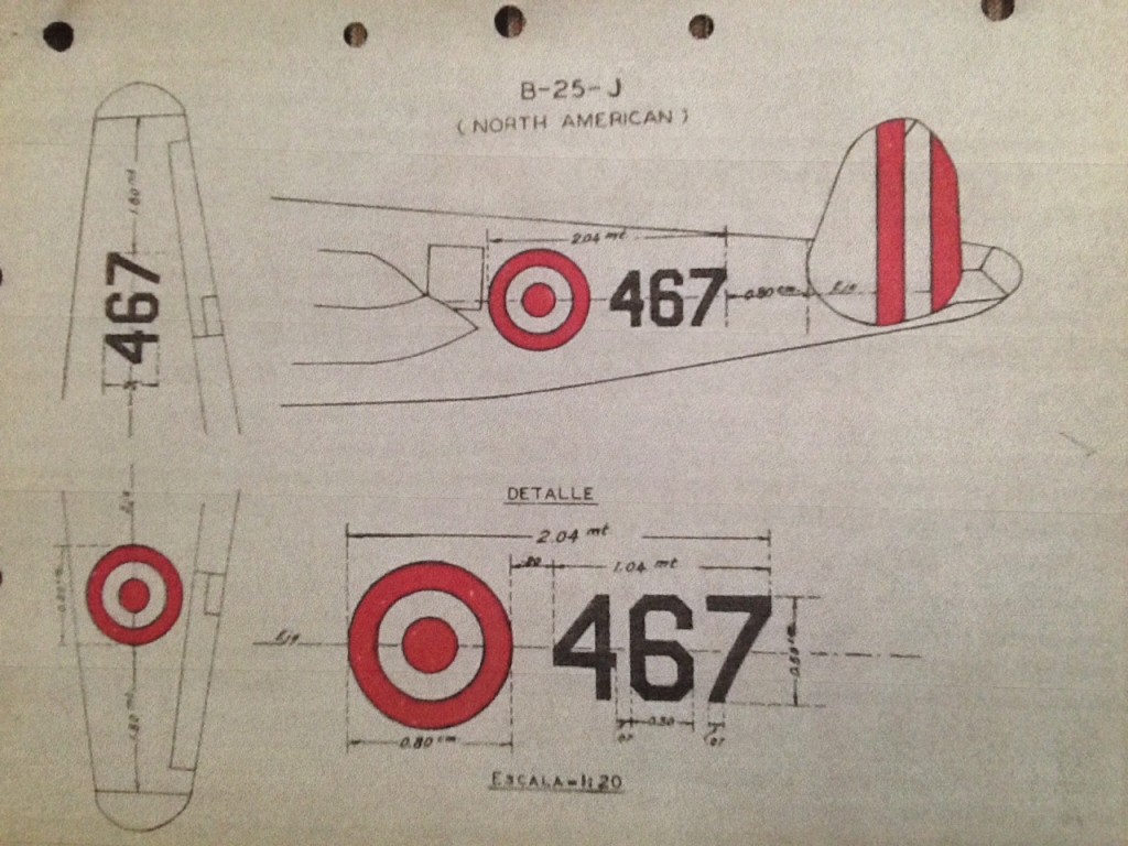 I reproduced the insignia of the plane based on a picture of my dad, Major General (R) Oscar G. Gagliardi Kindlimann, which was taken back in the 1950s next to the B-25 Bomber. My dad also provided me with the official specifications of the location of the markings on the plane. Here are a few pictures of the references and the finished model.