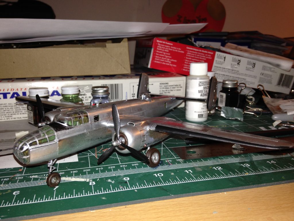 I decided to build a model of the B-25 bomber in service with the Peruvian Air Force. I had a few references and an old Monogram Snaptite model kit, level 1, on a scale of 1/72. I painted the model silver and retouched the surfaces using aluminum foil and a #2 pencil. I also added some weathering effects. I made the decals using inkjet waterslide paper.