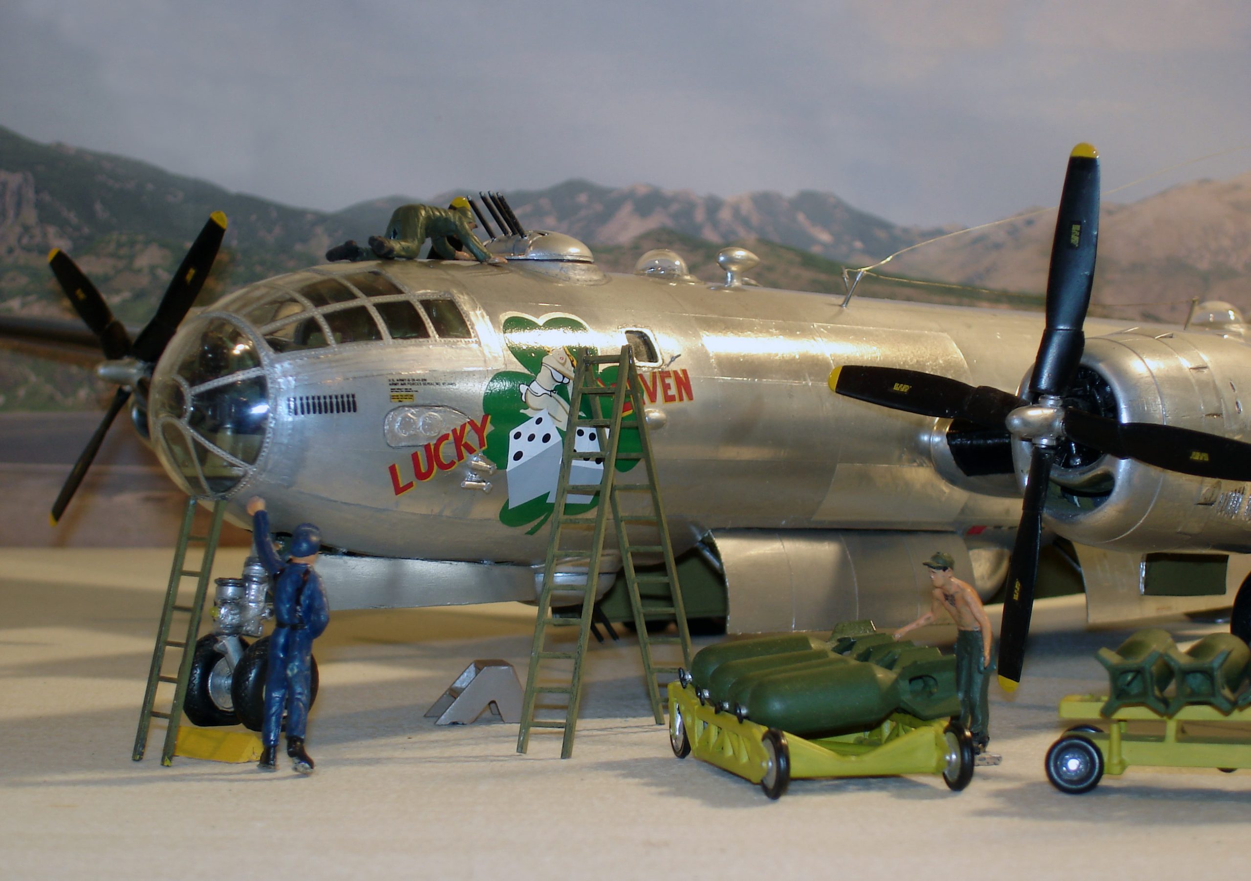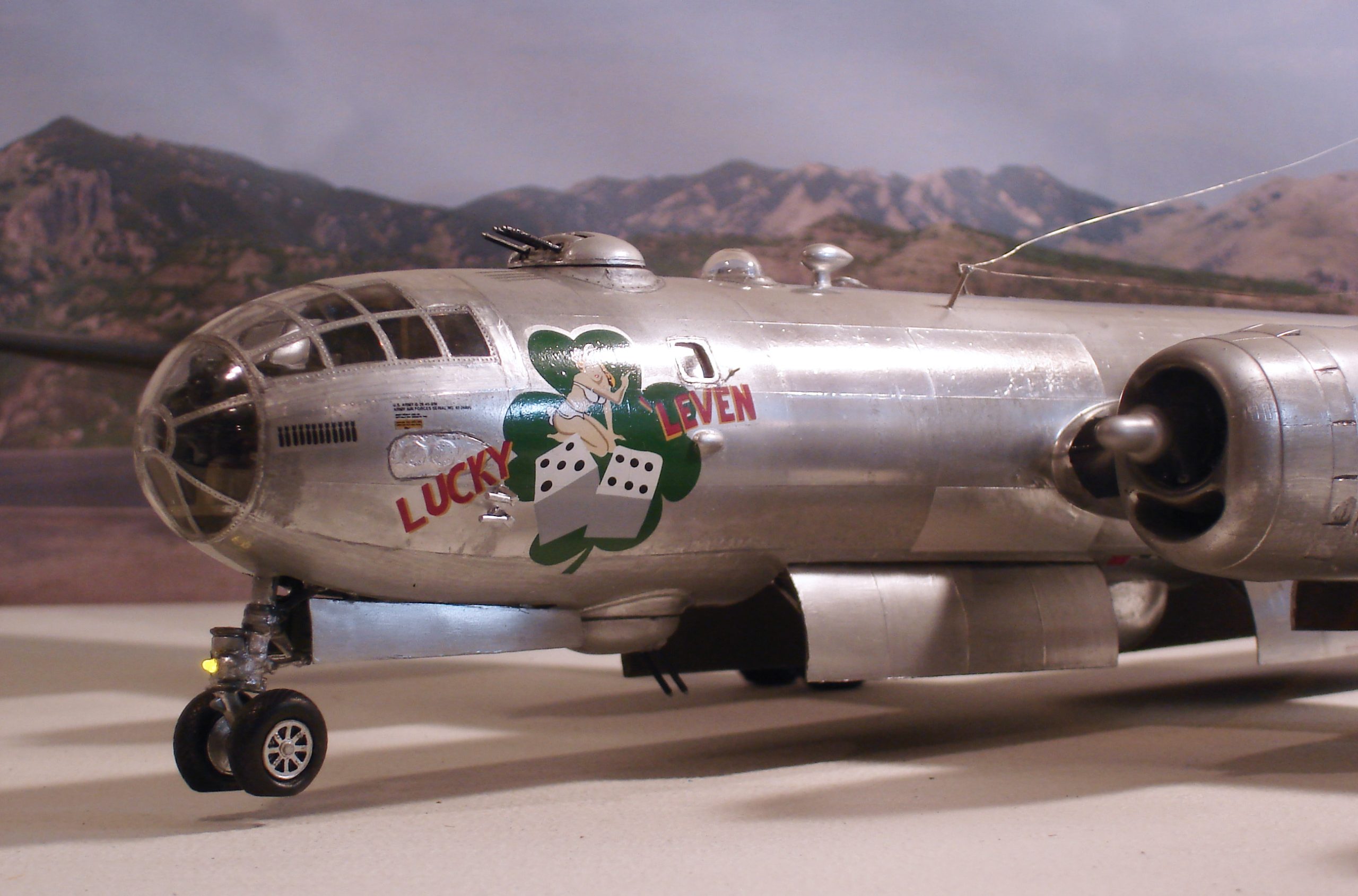 Here are a few pictures of the finished model. These pictures were taken using a diorama setup. This massive model will occupy ample space for those thinking about building this model on a scale of 1:48. Before you build it, have enough space to display it. You may also want to consider building this model on a scale of 1:72. Modern electronic component miniaturization will allow you to install miniature electric motors and LEDs to a 1:72 scale model of the Boeing B-29 Superfortress.