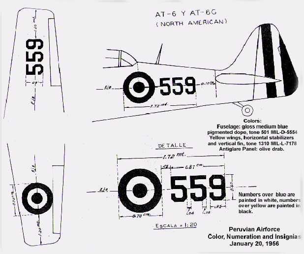 The following diagram was obtained from the archives of the Peruvian Air Force, and it shows in detail how the insignias and numbering scheme had to be applied to the airplanes. The diagram also shows the Federal Standard reference colors.
