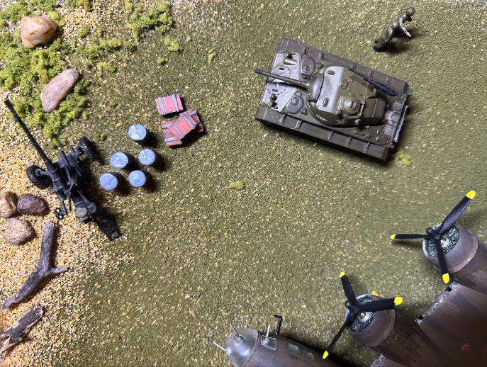 Diorama of a model of the B-17F Flying Fortress. 1/72 Revell Kit modified with 4 electric motors. The diorama also has a Hasegawa model kit of the Light Tank M-24 Chaffee in scale 1/72.
