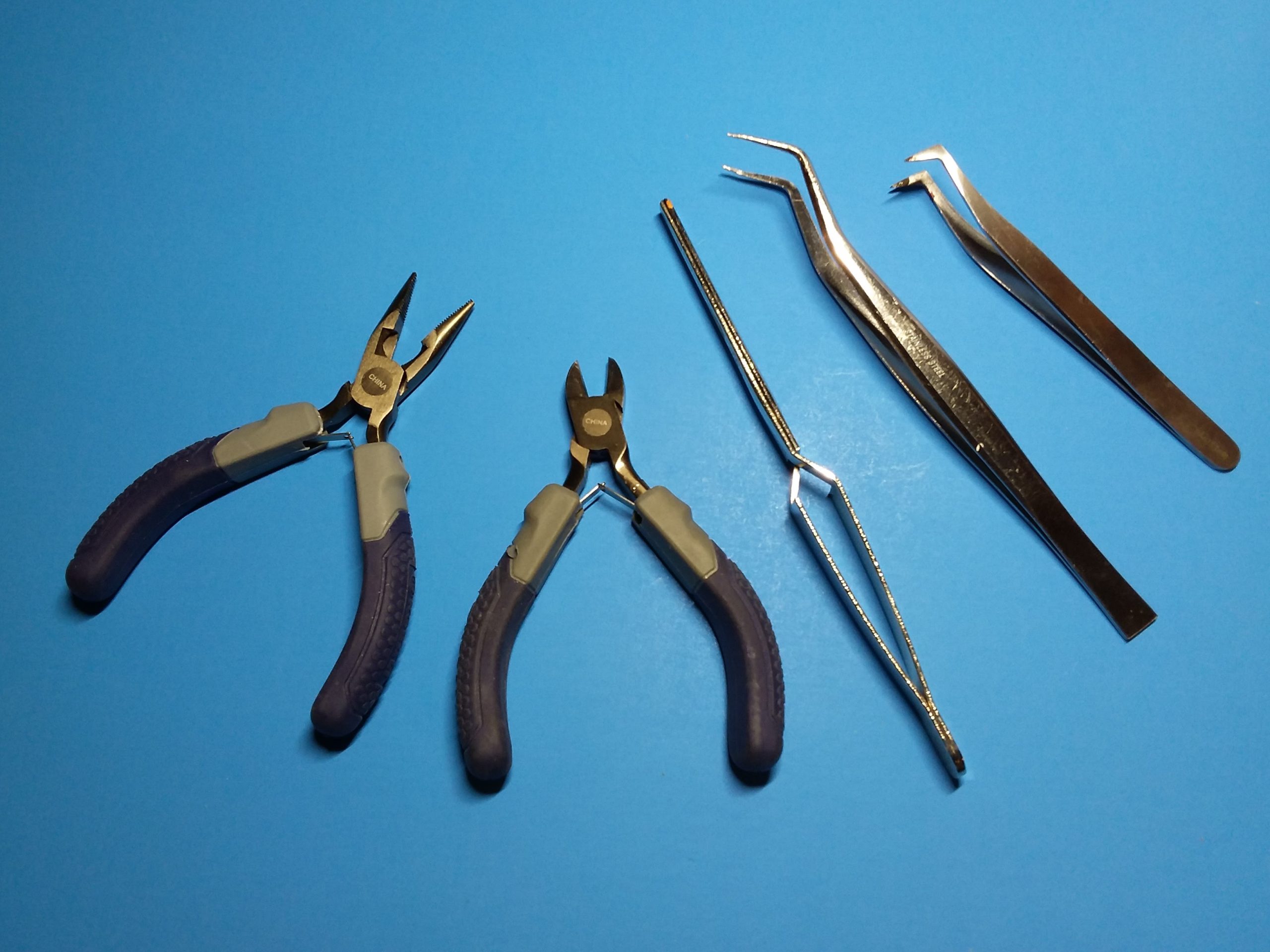 Standard or cross-action tweezers are indispensable. These tools are ideal for handling small pieces or holding parts for painting or gluing.