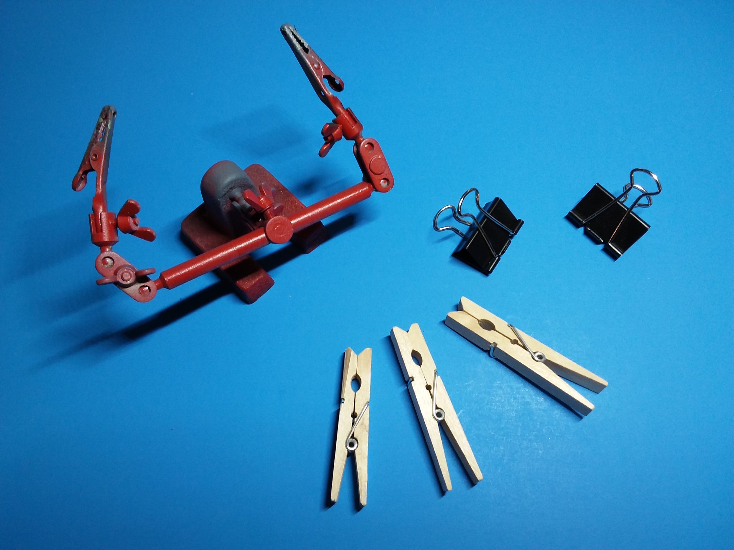 Standard clamps are also handy for holding components together for gluing, especially for more significant parts like wing halves, when parts need to stay together temporarily for extended periods.
